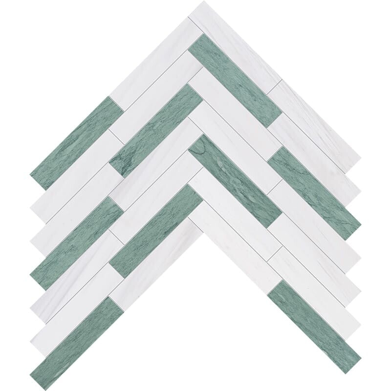 Verde Capri, Snow White Honed Large Herringbone Marble Mosaic (MYS)